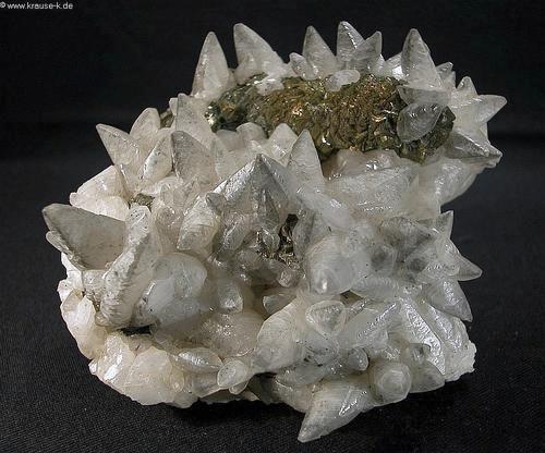 Grau/weiße Calcitkristalle vergesellschaftet mit Markasit.