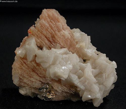 Größe der Stufe: 5,4 x 4,3 x 3,4 cm.Weiße Dolomitkristalle als typisch gekrümmte Rhomboederauf fleischfarbenem Baryt, begleitet von Kupferkies undkleinen, hochglänzenden Strontianitkristallen.
