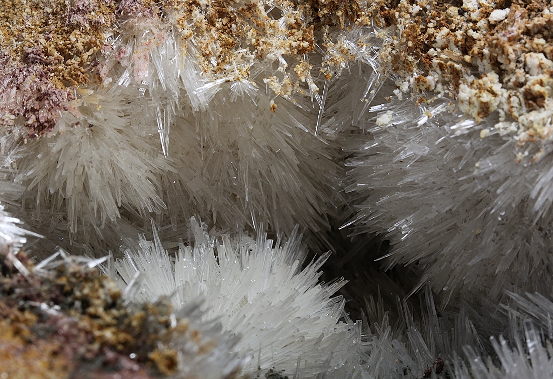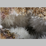 Kugelige Aggregate aus nadelspitzen Aragonitkristallen auf Matrix.