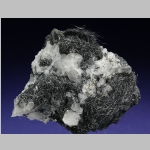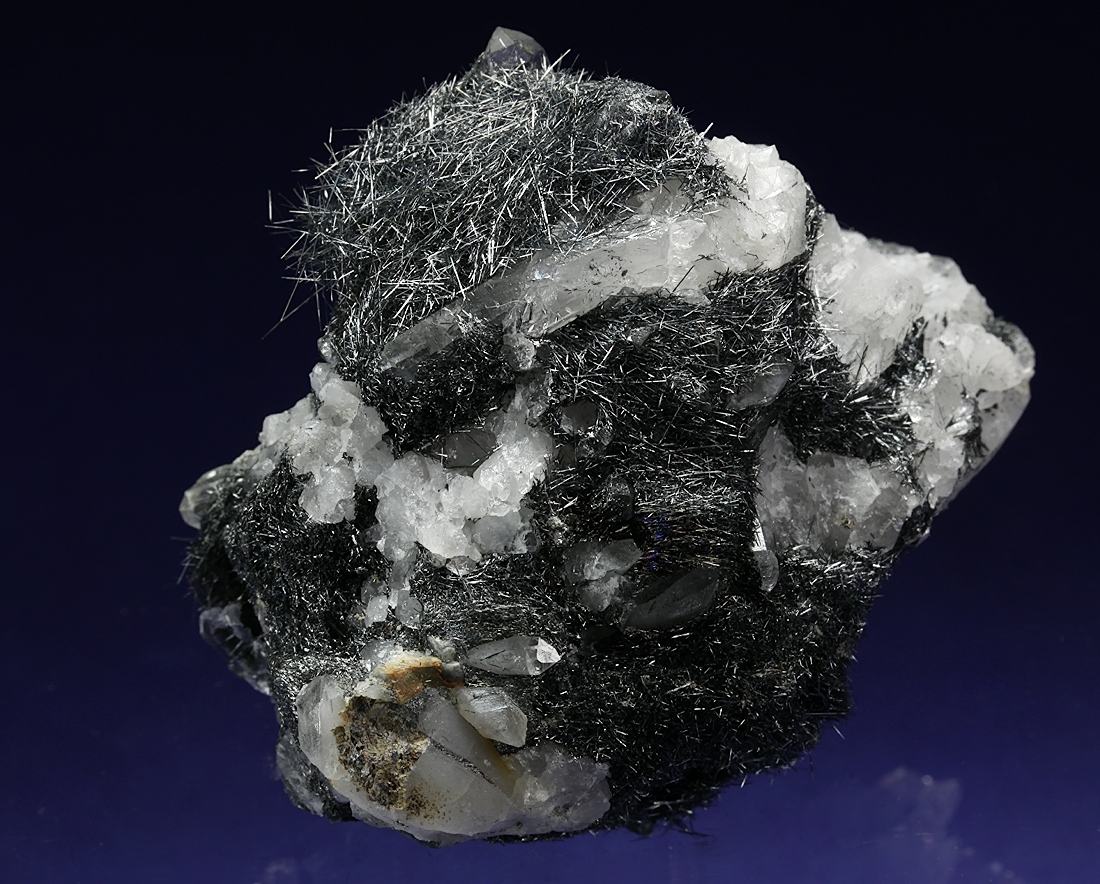 Quarzmatrix ringsum reich bewachsen mit Boulangeritkristallen, begleitet von kleinen Quarzkristallen.