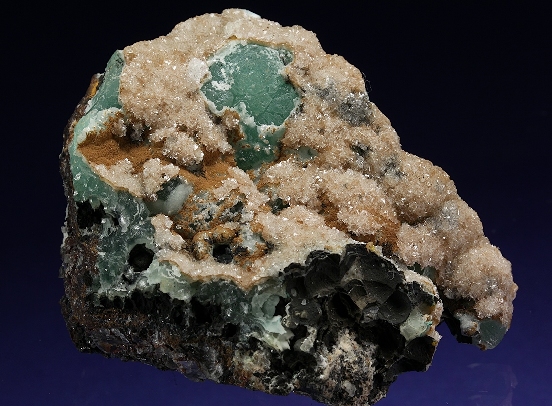 Auf nierig traubigem CU-Aragonit sitzen unzählige, kleine Hemimorphitkristalle.