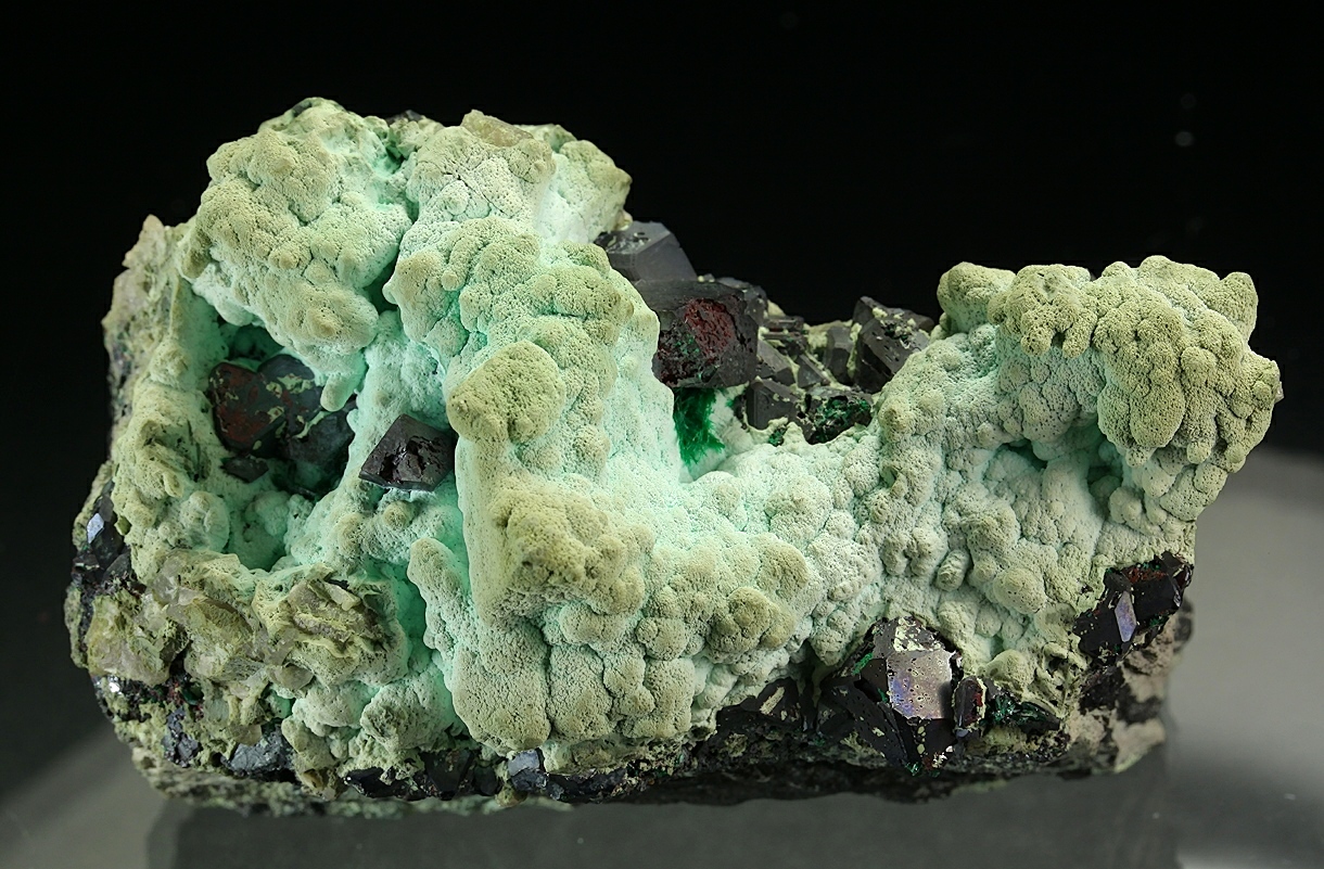 Auf Matrix sitzen große, tiefrote Cupritkristalle, die teilweise von