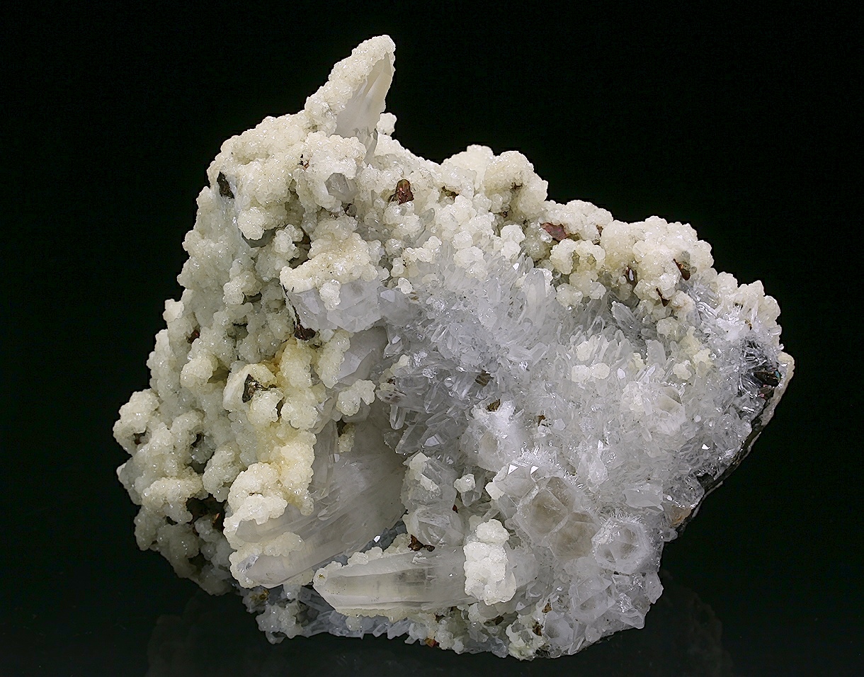 Eine Sphaleritmatrix ist ringsum mit Quarzkristallen bis zu 2,5 cm bewachsen,