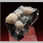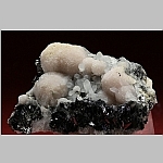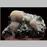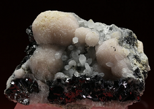 Kugelig ausgebildete Aggregate aus Rhodochrosit, begleitet von milchigen Quarzkristallen auf Matrix.