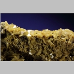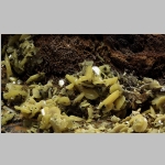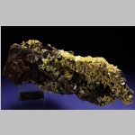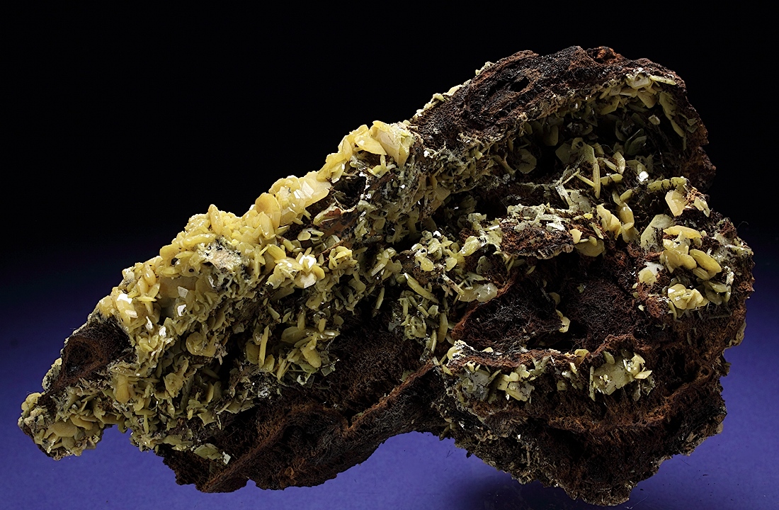 Auf Limonitmatrix sitzen unzählige, hochglänzende gelbe Wulfenitkristalle. Die Stufe ist ringsum bewachsen.